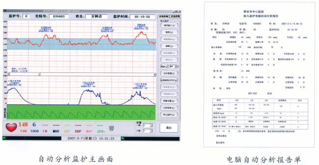 在監(jiān)護中對胎心率基線、細變異大小、加速、各種減速及胎動的變化進行實時在線分析,并將分析結果顯示在屏幕上,監(jiān)護結束時對所有的監(jiān)護信息進行綜合分析,給出監(jiān)護診斷結果及胎兒評分供臨床參考,使得每個婦產科大夫都能輕松進行胎兒監(jiān)護圖形分析和診斷。