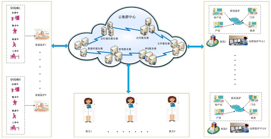 系統(tǒng)由遠程監(jiān)護工作站一套、遠程監(jiān)護終端設(shè)備MD1000C型胎兒監(jiān)護儀若干臺、樂福孕媽APP、下級醫(yī)院胎兒監(jiān)護設(shè)備MD9801型胎兒監(jiān)護儀組成??梢詫崿F(xiàn)上下級醫(yī)院醫(yī)聯(lián)體遠程監(jiān)護遠程會診以及遠程家庭胎兒監(jiān)護。